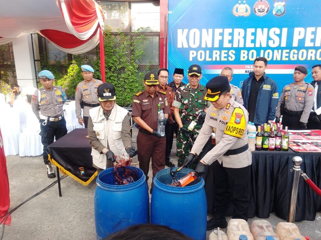 Setelah kegiatan pers rilis, acara dilanjutkan dengan pemusnahan barang bukti minuman keras yang telah diamankan oleh petugas. Pemusnahan dilakukan sebagai bentuk komitmen kepolisian dalam memberantas peredaran miras yang dapat mengganggu ketertiban dan keamanan masyarakat.