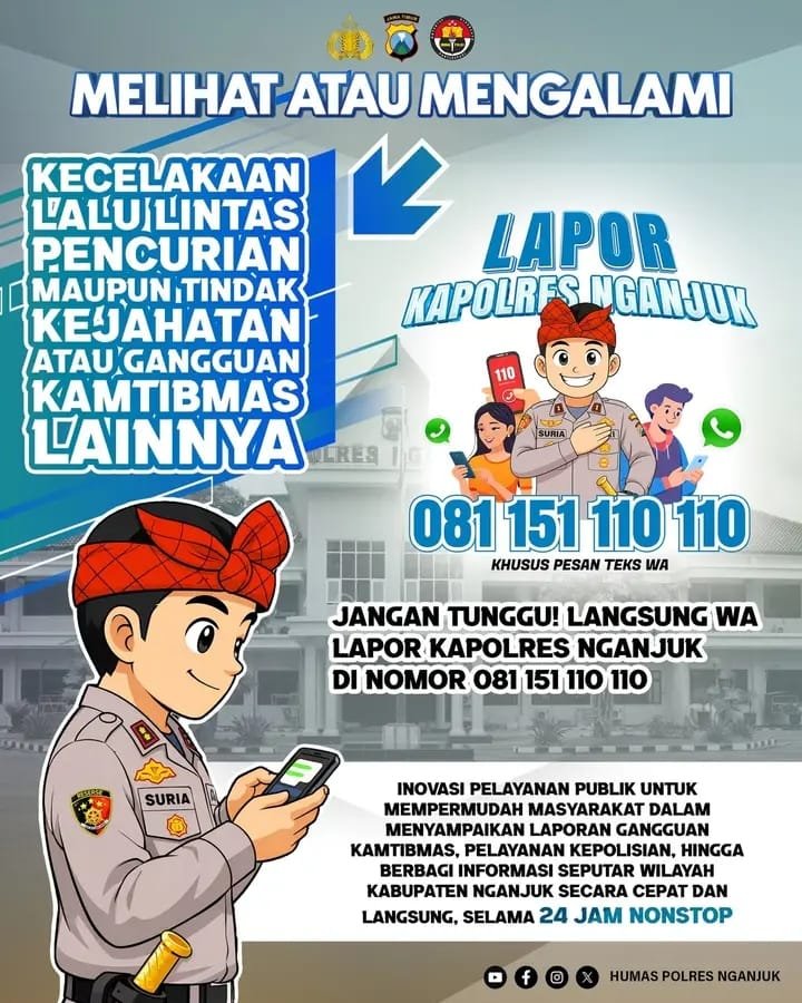 NGANJUK – Sentral1.com – Polres Nganjuk mengajak seluruh masyarakat Kabupaten Nganjuk dan sekitarnya untuk memanfaatkan layanan pengaduan Call Center 110 serta layanan WhatsApp (WA) Lapor Kapolres guna melaporkan berbagai kejadian yang terjadi di lingkungan sekitar.